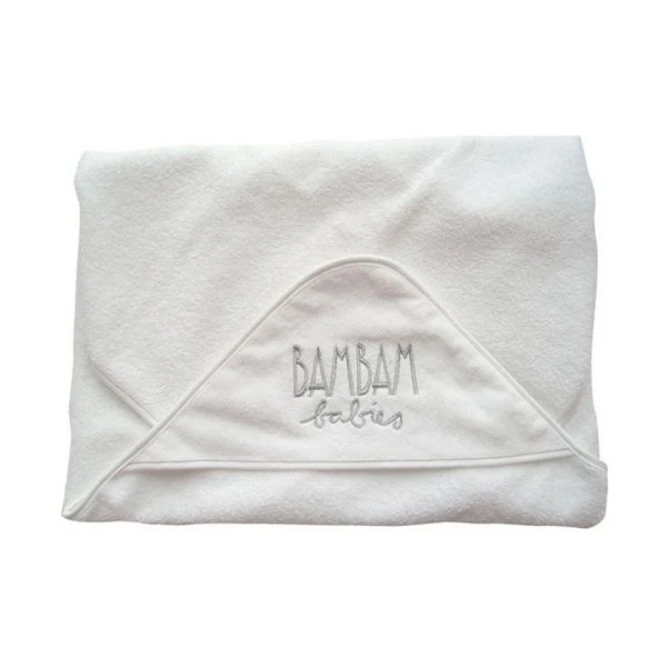 Prachtig zilveren baby omslagdoek met mutsje van het merk BamBam. Het is afgewerkt met een zilveren tekst op het mutsje.